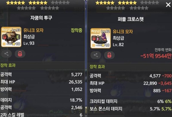 왼쪽 투구는 총 공격력도 높고, 데미지 증가 옵션까지 붙어있어서 딜 상승에 훨씬 도움이 될 겁니다. 오른쪽 투구의 크리티컬 데미지%는 아쉽지만 공격력 차이가 너무 커서... 딜 효율은 왼쪽이 더 좋을 것 같아요.