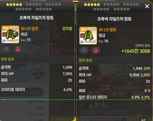 오른쪽 망토는 공격력도 더 높고, 일반 몬스터 데미지까지 붙어있어서 사냥 효율이 훨씬 좋을 겁니다!