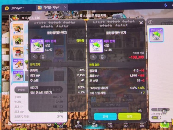 👉 아이템 : '상의' 비교 결과, 오른쪽을 추천합니다! 🔍 🔥오른쪽 : 총 공격력 6,277, 크리티컬 데미지 5.3% 🔍 왼쪽 : 총 공격력 3,446, 일반 몬스터 데미지 5% 💡 분석 코멘트 오른쪽 '블루 바즈라'는 총 공격력도 높지만, 특히 '크리티컬 데미지' 옵션 덕분에 훨씬 강력합니다! 왼쪽 아이템의 '일반 몬스터 데미지'로는 따라갈 수 없…