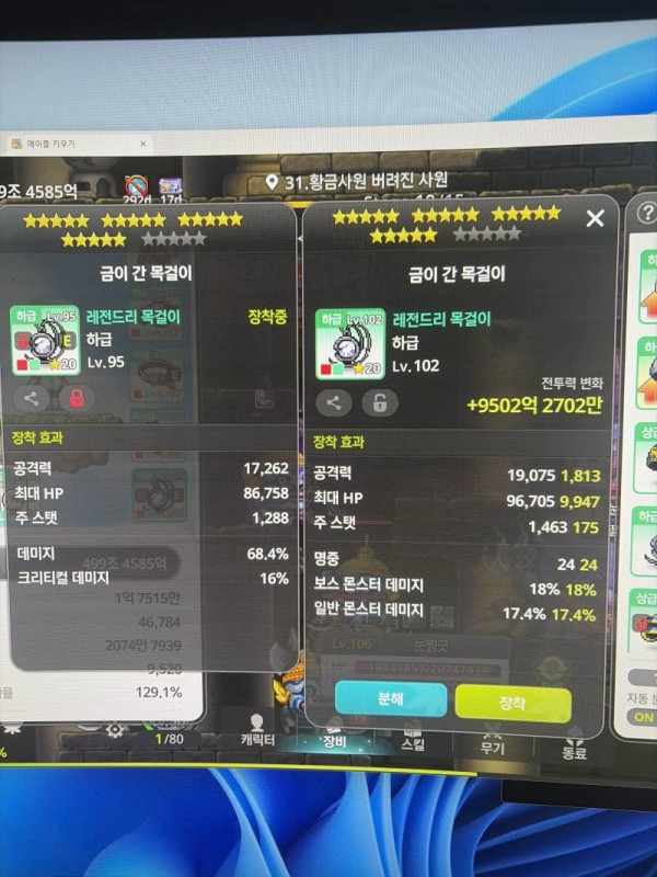 오른쪽은 공격력이 더 높고, 보스 몬스터 데미지와 일반 몬스터 데미지 옵션이 붙어있어 사냥에 더 유리합니다.