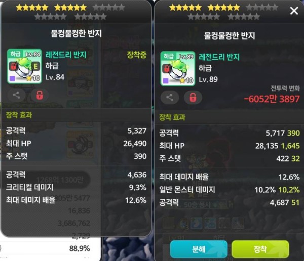 오른쪽 아이템은 총 공격력이 매우 높고, 최대 데미지 배율과 일반 몬스터 데미지까지 챙길 수 있습니다. 왼쪽 아이템의 크리티컬 데미지는 아쉽지만, 공격력 차이가 커서 오른쪽이 훨씬 좋습니다.