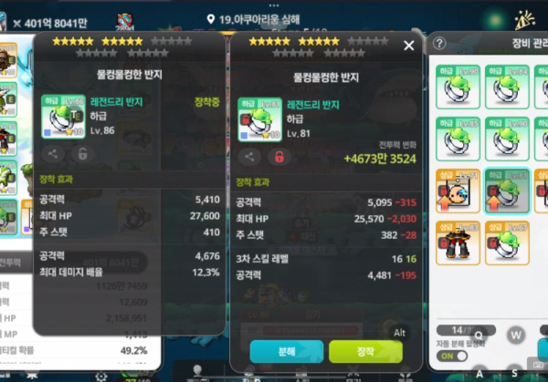 : 왼쪽 아이템에는 공격력 옵션이 없네요. 오른쪽 아이템의 공격력이 훨씬 높습니다.