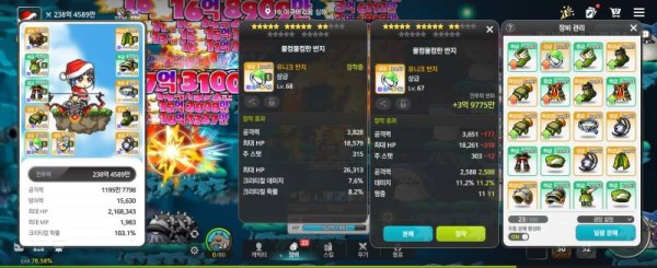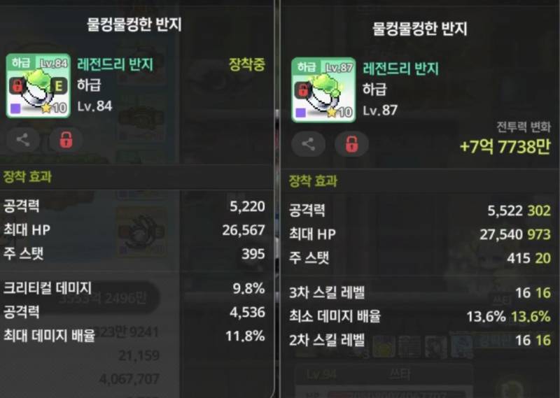 오른쪽 반지가 총 공격력은 약간 높지만, 크리티컬 데미지 옵션이 없어서 아쉽네요. 하지만 데미지 옵션이 있어서 최종적으로는 오른쪽을 추천합니다!