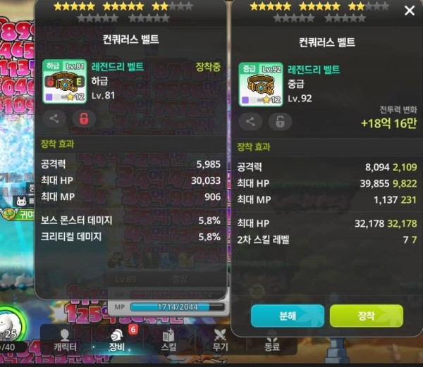 🔍 🔥 왼쪽 : 총 공격력 5,985, 보스 몬스터 데미지 5.8%, 크리티컬 데미지 5.8%