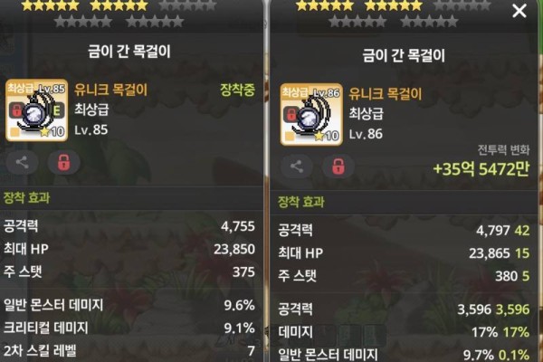 오른쪽 아이템은 공격력도 높을 뿐만 아니라 데미지 옵션까지 붙어있어 훨씬 강력합니다. 왼쪽 아이템의 크리티컬 데미지는 아쉽지만, 공격력 차이를 극복하기는 어렵습니다.