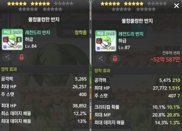 오른쪽 반지는 공격력이 조금 더 높고, 크리티컬 확률과 최대 데미지 배율까지 붙어있으니 무조건 오른쪽으로 갈아타는 게 이득입니다! 왼쪽은 최대 데미지 배율이 조금 낮네요.