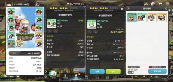 오른쪽 아이템은 공격력이 조금 낮지만, 귀한 크리티컬 데미지 옵션이 붙어있어 훨씬 강력합니다! 왼쪽 아이템의 최대 데미지 배율은 아쉽지만, 크리티컬 데미지의 효율을 따라가기엔 역부족입니다.