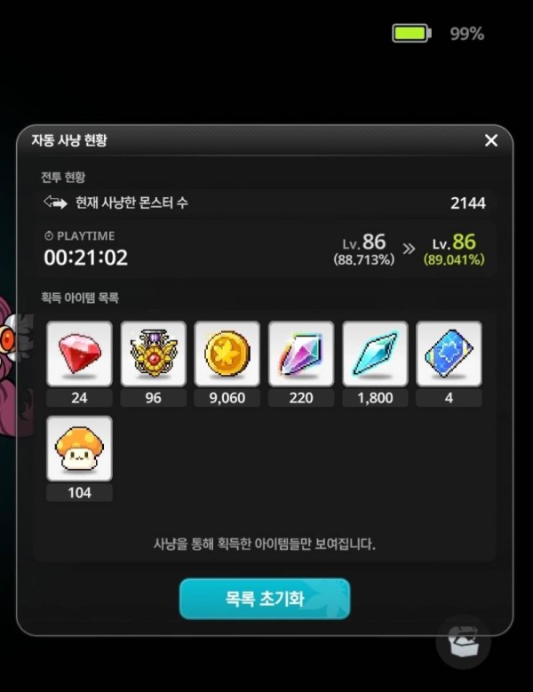 - 획득 경험치: 0.328% (89.041% - 88.713%)