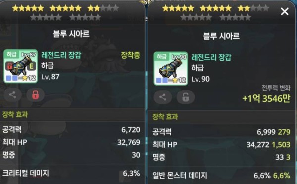 오른쪽의 총 공격력과 일반 몬스터 데미지 옵션이 왼쪽보다 좋습니다.