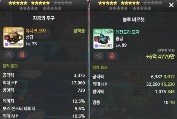 블루 바르햇이 자쿰의 투구보다 총 공격력에서 압도적인 우위를 보입니다. 자쿰의 투구에 붙은 데미지, 보스 몬스터 데미지 옵션으로는 공격력 차이를 극복하기 어렵습니다.