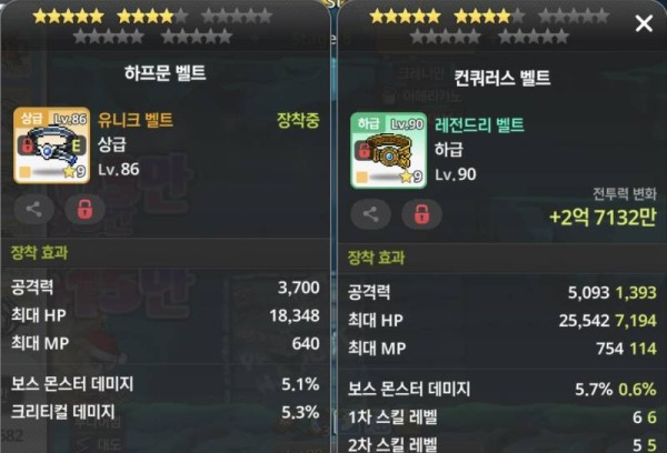 오른쪽의 총 공격력이 훨씬 높고, 스킬 레벨 옵션이 붙어있어 딜 상승에 도움이 될 겁니다. 왼쪽의 크리티컬 데미지도 좋지만, 오른쪽의 공격력 차이를 극복하긴 어렵습니다.