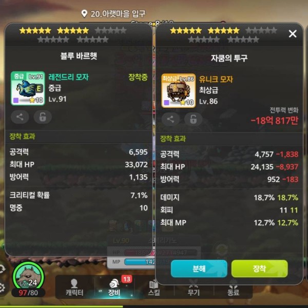 : 왼쪽 아이템은 공격력, 최대 HP, 방어력, 크리티컬 확률, 명중 옵션을 가지고 있지만 오른쪽 아이템은 데미지% 옵션이 있습니다. 데미지%가 있기 때문에 오른쪽 아이템을 추천합니다.