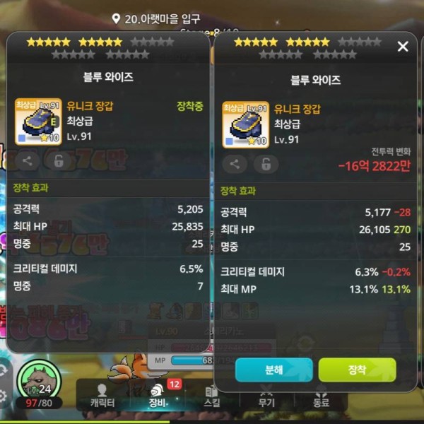 오른쪽 : 총 공격력 5,177, 크리티컬 데미지 6.3%, 최대 MP