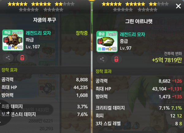 👉 아이템 : '자쿰의 투구' 비교 결과, 오른쪽을 추천합니다! 🔍 🔥 오른쪽 : 데미지 18.7%, 일반 몬스터 데미지 6.3%, 총 공격력 5,643 🔍 왼쪽 : 최종 데미지 3.7%, 총 공격력 8,076 💡 분석 코멘트 오른쪽 투구는 [데미지]와 [일반 몬스터 데미지] 옵션이 붙어있어 사냥 효율이 훨씬 좋습니다. 왼쪽의 총 공격력이 높긴 하지만,…