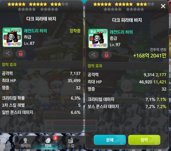 오른쪽 바지는 공격력도 높지만, 핵심은 크리티컬 데미지! 보스 몬스터 데미지까지 붙어있으니 사냥 효율이 훨씬 좋을 겁니다. 왼쪽 바지는 공격력이 아쉽고, 크리티컬 확률이나 일반 몬스터 데미지로는 오른쪽을 따라갈 수 없어요.