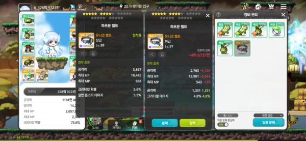 왼쪽 : 총 공격력 3867, 크리티컬 확률 5.6%, 일반 몬스터 데미지 5.5%