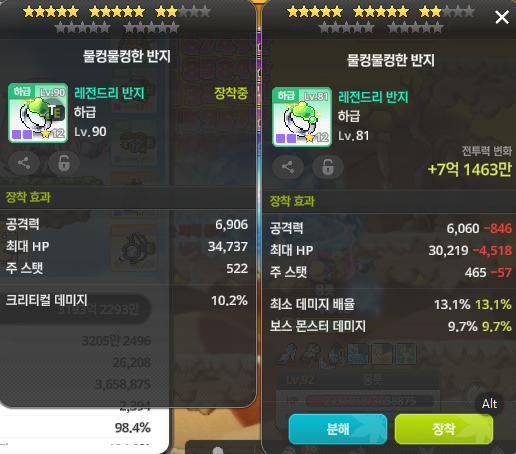 👉 아이템 : '물컹물컹한 반지' 비교 결과, 왼쪽을 추천합니다! 🔍 🔥 왼쪽 : 총 공격력 3,400, 크리티컬 데미지 8.6% 🔍 오른쪽 : 총 공격력 3,300, 2차 스킬 레벨, 3차 스킬 레벨 💡 분석 코멘트 왼쪽 반지는 핵심 옵션인 크리티컬 데미지가 붙어있어 효율이 압도적입니다. 오른쪽 반지에 붙은 스킬 레벨 옵션은 전투에 큰 영향을 주지 못…