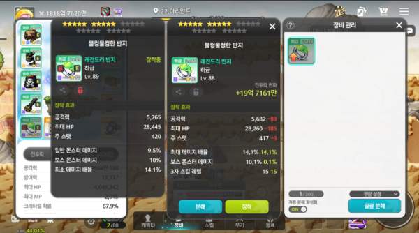 👉 아이템 : '물컹물컹한 반지' 비교 결과, 오른쪽을 추천합니다! 🔍 🔥 오른쪽 : 총 공격력 2,730, 크리티컬 데미지 7.4%, 크리티컬 확률 7% 🔍 왼쪽 : 총 공격력 2,788, 3차 스킬 레벨 9 💡 분석 코멘트 오른쪽 반지는 크리티컬 데미지 옵션이 있어서, 왼쪽 반지보다 훨씬 강력합니다. 3차 스킬 레벨은 큰 의미 없으니 고민할 필요도 …