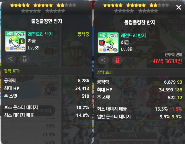 오른쪽 반지는 [최소 데미지 배율]과 [일반 몬스터 데미지] 옵션이 있어, 왼쪽의 [보스 몬스터 데미지] 옵션보다 사냥에서 더 높은 효율을 보여줄 겁니다!