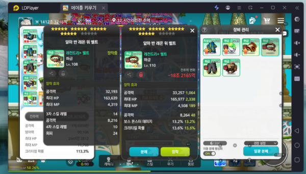 오른쪽 벨트가 공격력도 높고 보스 몬스터 데미지, 크리티컬 확률까지 붙어있어서 훨씬 좋네요. 왼쪽은 스킬 레벨 옵션으로는 오른쪽을 절대 이길 수 없어요.