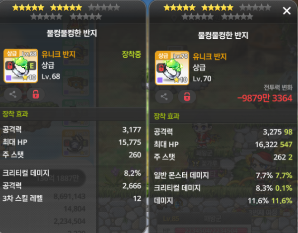 왼쪽 아이템의 총 공격력은 높지만, 오른쪽 아이템은 '일반 몬스터 데미지', '데미지', '크리티컬 데미지' 옵션이 골고루 붙어있어 사냥 효율이 훨씬 좋습니다.