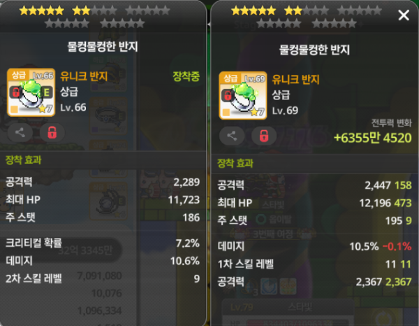 오른쪽은 공격력 옵션이 추가로 붙어있어, 총 공격력이 훨씬 높습니다.