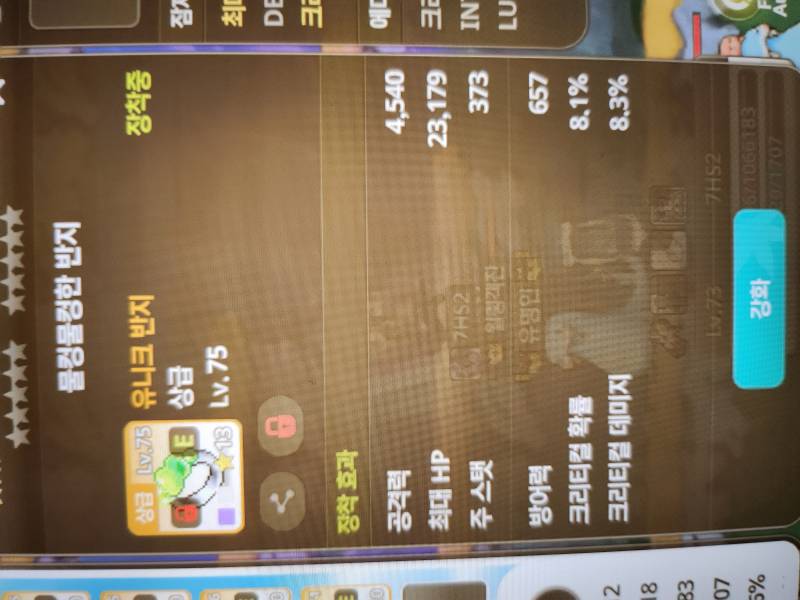 👉 아이템 : '물컹물컹한 반지' 비교 결과, 오른쪽을 추천합니다! 🔍 아이템 상세 비교 왼쪽 : 총 공격력 4065, 크리티컬 데미지 8% 🔥 오른쪽 : 총 공격력 2617, 크리티컬 확률 6.8%, 일반 몬스터 데미지 7.1% 💡 분석 코멘트 오른쪽 반지가 총 공격력은 낮지만, 크리티컬 확률과 일반 몬스터 데미지 옵션이 붙어있어 사냥 효율이 더 좋습…