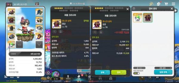 오른쪽 아이템은 공격력은 약간 더 높고, 깡 크리티컬 데미지 옵션이 붙어있어서 효율이 훨씬 좋습니다.