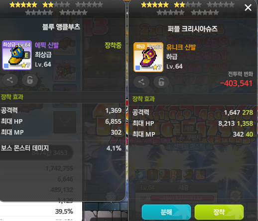 오른쪽 신발이 공격력으로 압승입니다. 보스 몬스터 데미지도 좋은 옵션이지만 공격력 차이가 너무 커요.