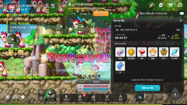 - 43분 57초 동안 사냥하셨고, 획득 경험치는 0.569% 네요.