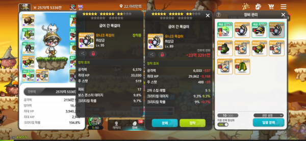 왼쪽 : 보스 몬스터 데미지 9.8%, 크리티컬 확률 9.7%, 총 공격력 6,570