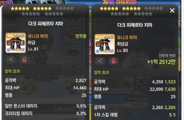 오른쪽은 공격력 옵션이 붙어서 총 공격력이 월등히 높고, 1차 스킬 레벨도 붙어있네요. 왼쪽은 크리티컬 데미지 옵션이 있지만, 공격력 차이가 커서 오른쪽이 훨씬 좋습니다!