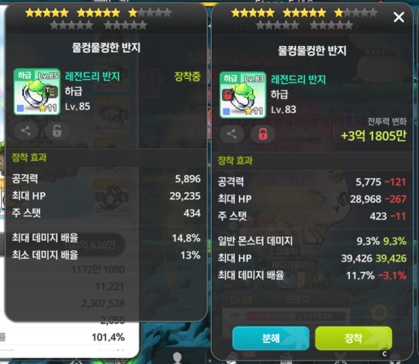오른쪽 반지는 일반 몬스터 데미지와 최대 데미지 배율을 가지고 있어 사냥에 더 유리합니다. 왼쪽의 공격력과 최대 데미지 배율, 최소 데미지 배율도 좋지만, 몬스터 데미지 옵션이 있는 오른쪽이 더 효율적입니다!
