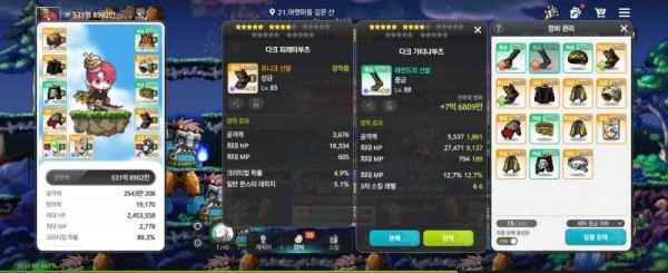 🔍 🔥 오른쪽 : 총 공격력 7,398, 최대 MP 12.7%, 3차 스킬 레벨
