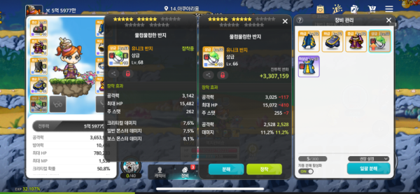 오른쪽은 총 공격력이 높고 데미지%도 붙어있어 안정적인 딜 상승을 기대할 수 있습니다. 왼쪽은 크리티컬 데미지, 일반 몬스터 데미지, 보스 몬스터 데미지가 있지만, 총 공격력 차이가 너무 커서... 흠... 쉽지 않네요.