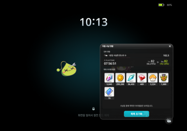 - 이 속도라면... 82레벨에서 83레벨까지 (21.871%/0.275%) = 약 79시간, 3일하고도 7시간 뒤에는 레벨업 하겠네요... 😭