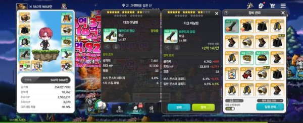 왼쪽 : 총 공격력 7461, 보스 몬스터 데미지 6.8%, 1차 스킬 레벨