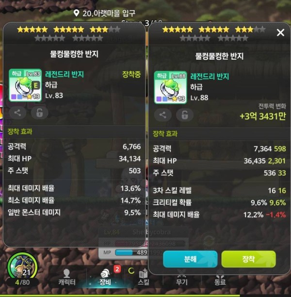 오른쪽 반지는 3차 스킬 레벨이 붙어있지만, 크리티컬 확률 옵션 덕분에 왼쪽 반지보다 좋습니다. 크리티컬은 무시할 수 없는 중요한 스탯입니다!