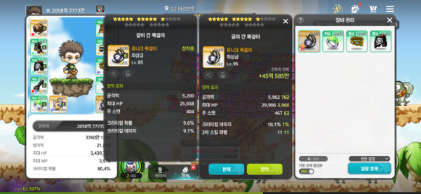 🔍 왼쪽 : 총 공격력 5,200, 크리티컬 확률 9.6%, 크리티컬 데미지 9.1%