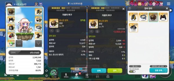 🔍 🔥 왼쪽 : 총 공격력 2,549, 데미지 11%, 보스 몬스터 데미지 4.5%