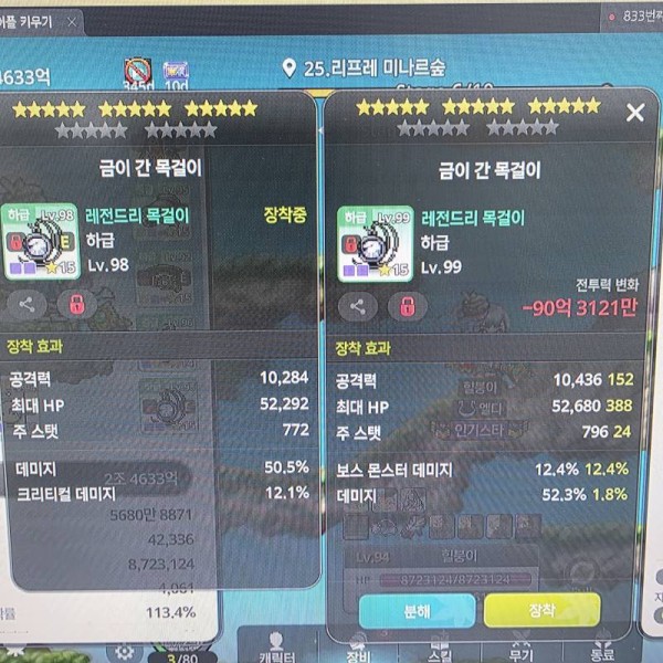 오른쪽 아이템은 데미지%와 보스 몬스터 데미지%가 붙어있어 딜 상승에 더 도움이 될 겁니다. 왼쪽 아이템의 크리티컬 데미지는 아쉽지만, 오른쪽의 효율이 더 높습니다!