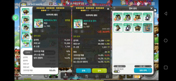 🔍 🔥 오른쪽 : 총 공격력 17,544, 크리티컬 데미지 16.2%, 보스 몬스터 데미지 16.5%