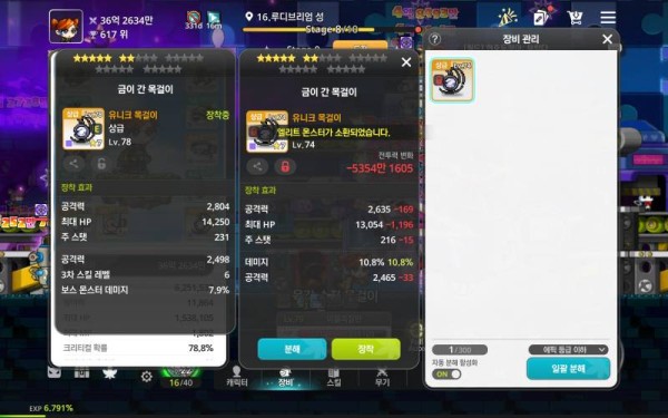 왼쪽 : 총 공격력 2,498, 보스 몬스터 데미지 7.9%, 크리티컬 확률 78.8%