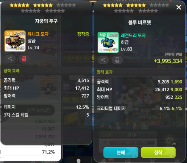 👉 아이템 : '다크 카날 후드' vs '자쿰의 투구' 비교 결과, 오른쪽을 추천합니다! 🔍 아이템 상세 비교 왼쪽 : 총 공격력 9,155, 보스 몬스터 데미지 7.1%, 3차 스킬 레벨 🔥 오른쪽 : 총 공격력 7,065, 데미지 18.7%, 크리티컬 확률 6.6% 💡 분석 코멘트 오른쪽 투구는 공격력은 좀 낮아도 데미지%가 붙어있어서, 3차 스킬 …