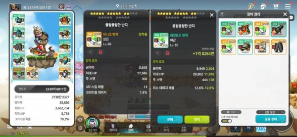 🔍 왼쪽 : 총 공격력 3645, 크리티컬 데미지 7.8%, 3차 스킬 레벨