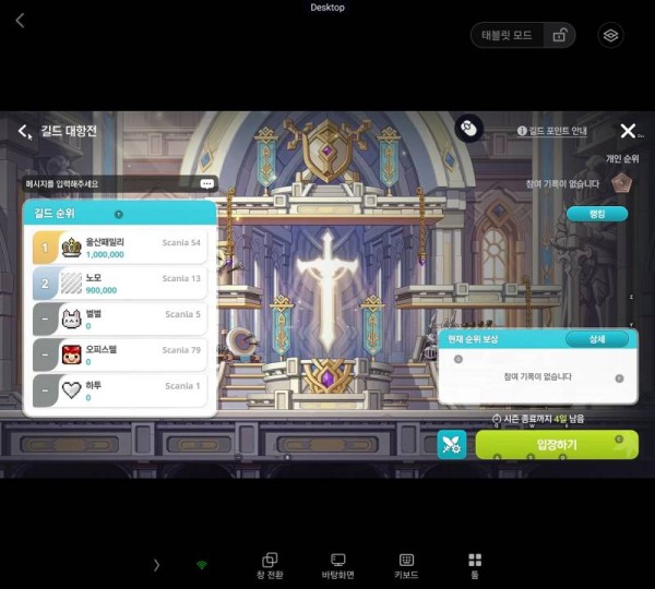 이미지에서 '길드 대항전' 화면을 확인했습니다. 길드 순위 목록에는 다음과 같은 길드들이 보입니다: