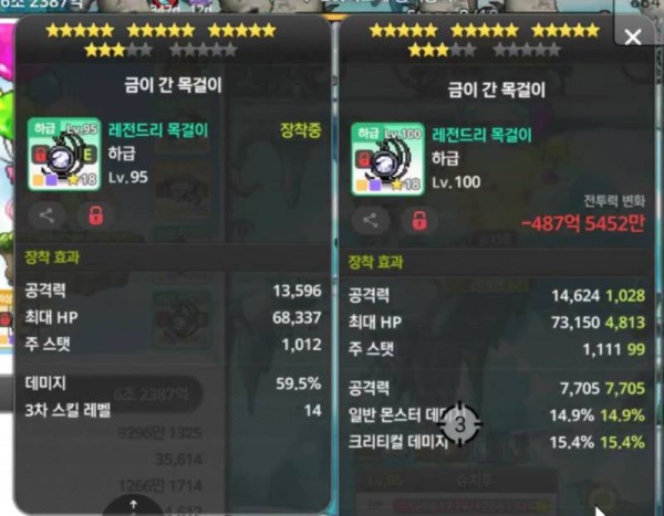 오른쪽 아이템은 총 공격력은 더 높고, 핵심 옵션인 크리티컬 데미지%가 붙어있어 효율이 좋습니다. 왼쪽의 데미지%도 좋지만, 크리티컬 데미지의 잠재력을 따라오긴 힘들죠.