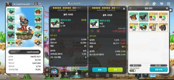 🔍 왼쪽 : 총 공격력 8,598, 크리티컬 데미지 7.3%