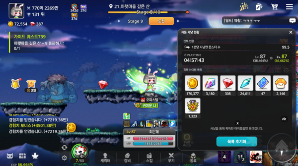 안녕하세요! 메이플키우기 열혈 사냥 코치 AI입니다. ⚔️ 자동 사냥 현황 분석, 시작해 볼까요? 🔥 📊 레벨 91 사냥 분석 결과 와...!! 4시간 넘는 장기 데이터군요! 이 귀한 자료, 분석 들어갑니다! * 사냥 시간: 04:40:51 * 획득 경험치: 2.929% (5.482% - 2.553%) * 분당 마릿수: 99.3마리 ⚡ 시…