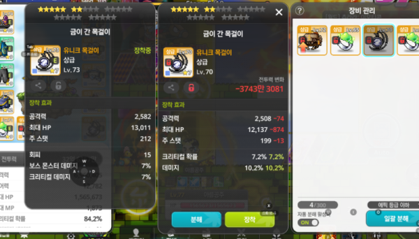 오른쪽은 공격력은 조금 낮지만 데미지 %가 붙어있어 효율이 더 좋습니다! 왼쪽은 크리티컬 데미지가 붙어있지만 하위옵션이므로 오른쪽 아이템을 추천드립니다.
